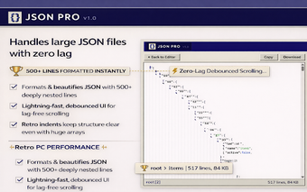 JSON Pro: 레트로 JSON 포매터는 원시 JSON 데이터를 시각적으로 매력적이고 쉽게 탐색할 수 있는 형식으로 변환해야 하는 개발자를 위해 설계된 Chrome 추가 기능입니다. 이 도구는 향수를 불러일으키는 90년대 워크스테이션 미학과 현대적인 성능 기능을 통합하여 복잡한 API 응답 및 깊이 중첩된 데이터 구조를 처리하는 데 적합합니다. 사용자는 가독성과 기능성을 우선시하는 깔끔한 인터페이스의 혜택을 받아 전체 작업 흐름을 향상시킵니다.